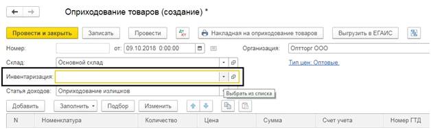И в появившемся окне нового документа, заполнив реквизиты, подбираем в поле «Инвентаризация» соответствующий документ, на основании которого хотим произвести заполнение.