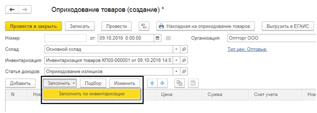При заполненной инвентаризации оприходовать излишки можно через меню «Склад» и журнал документов «Оприходование товаров».