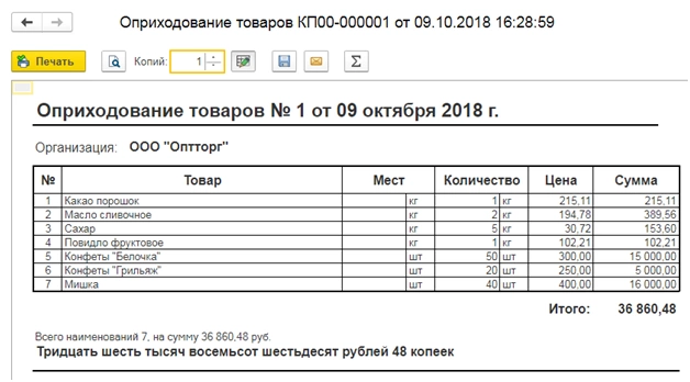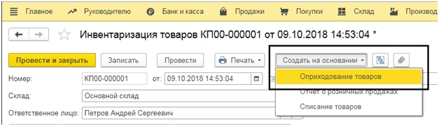 Теперь, просто нажав на «Создать на основании» и выбрав оприходование, мы получаем уже заполненный документ.