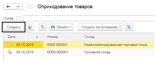 В журнале документов, нажав на «Создать», мы формируем новый документ оприходования.