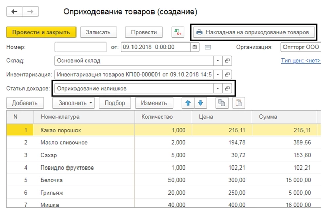 Мы видим, что данные по позициям товаров, по которым в результате ревизии были обнаружены излишки, занесены в соответствующие поля. Статья доходов – «Оприходование излишков», но если понадобится, это можно поправить. Тут же можно сгенерировать печатную форму накладной.