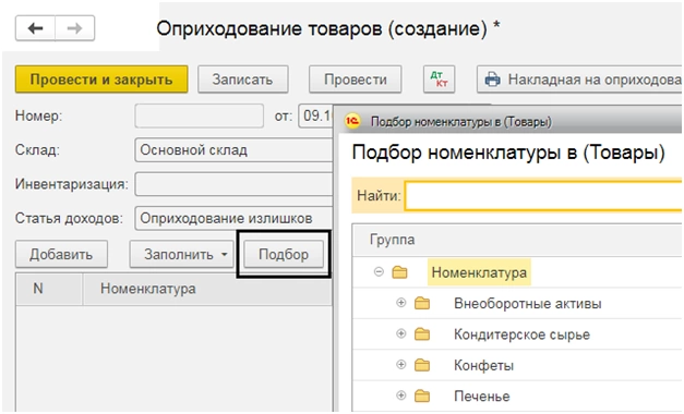Если оприходованию не предшествовала ревизия, то табличную часть заполняем руками: указываем склад приема, статью доходов из справочника «Прочие доходы и расходы» и с помощью кнопки «Подбор» – товары, которые необходимо оприходовать.
