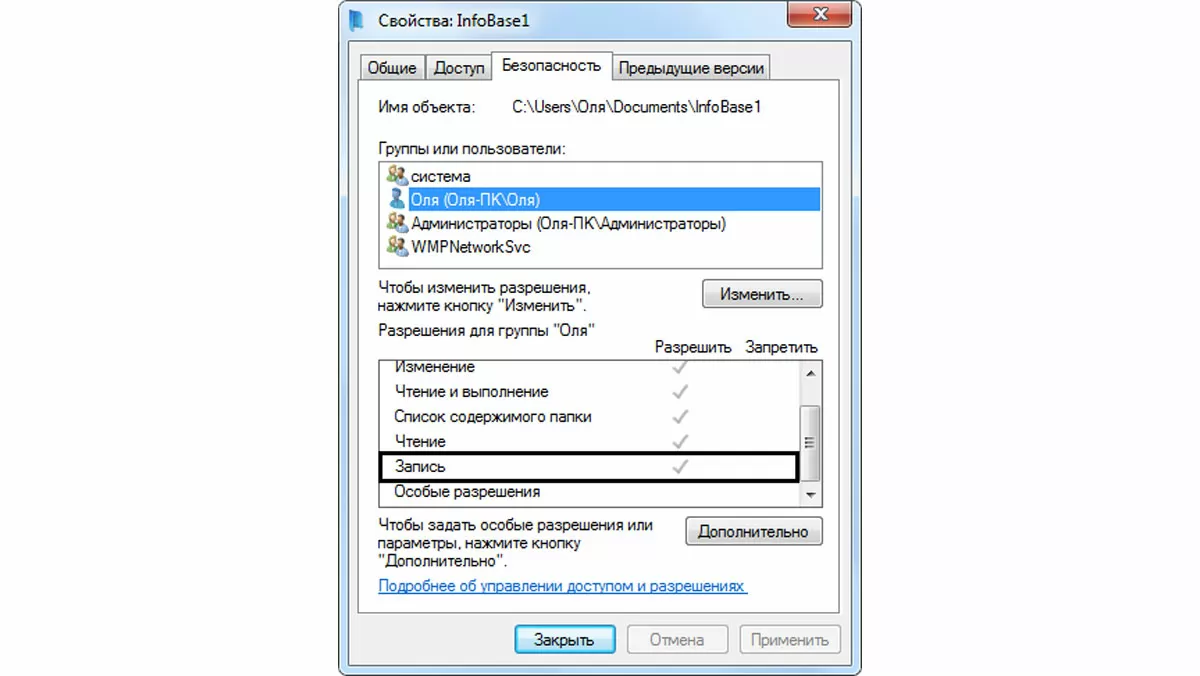 Если база располагается на локальном ПК, необходимо проверить на закладке «Безопасность», что для пользователя установлено разрешение на запись или не стоит запрет на запись.