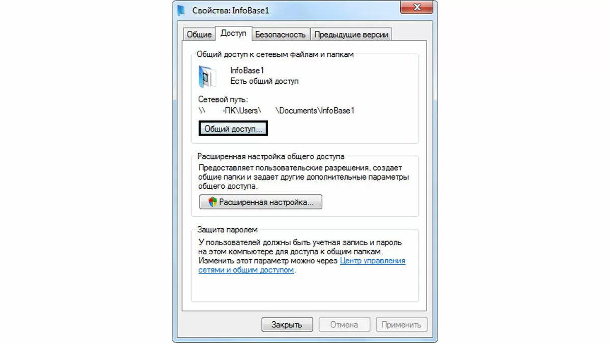 Само название ошибки уже говорит пользователю о случившемся: в первом случае – о нарушении прав доступа. Такое сможет случиться, когда пользователь скопировал информационную базу, подключил, а при открытии по сети всплыла такого рода ошибка с указанием сетевого пути к объекту. В этом случае, первое, на что сразу надо обратить внимание – на права доступа, щелкнув правой кнопкой на свойства объекта. Нажав кнопку «Общий доступ», проверить настройки.
