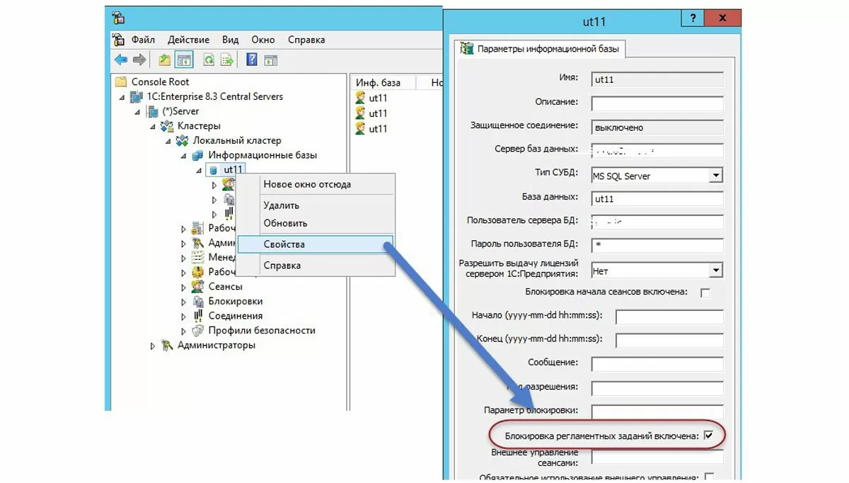 - В свойствах базы установить флаг Блокировка регламентных заданий включена, и после этого еще раз попробовать удалить зависшее задание.