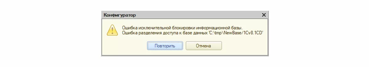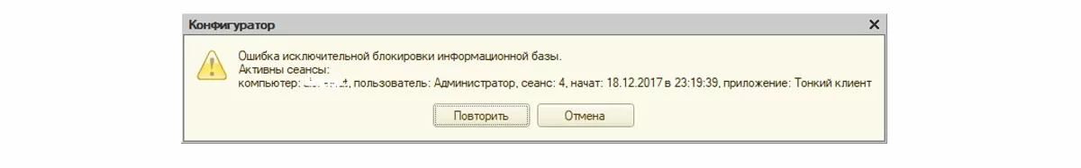 Чаще всего данное предупреждение конфигуратора возникает при выгрузке информационной базы или при обновлении конфигурации 1С. Для того чтобы исправить сложившуюся ситуацию и запустить работу конфигурации, в первую очередь необходимо выяснить причины ошибки исключительной блокировки информационной базы. Это может быть одна из следующих причин: