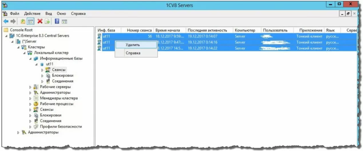 В первую очередь, необходимо попробовать удалить сеансы через консоль администрирования серверов, найдя в ней нужную базу и зайдя в меню Сеансы*.- Выделить нужные зависшие сеансы и удалить их через пункт контекстного меню;