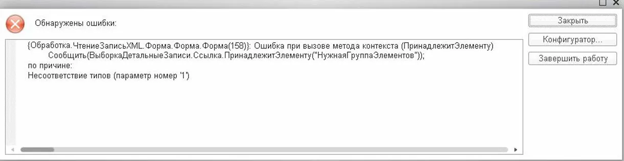 Но ошибки могут быть не только в текстах запросов. Допустим, мы хотим выбрать всю номенклатуру и узнать, входит ли она в определенную группу. Проверка происходит с помощью метода «ПринадлежитЭлементу» и его параметра, который должен быть типа СправочникСсылка. Мы опять допускаем ошибку и вместо ссылки в параметр метода помещаем строку, содержащую имя переменной.