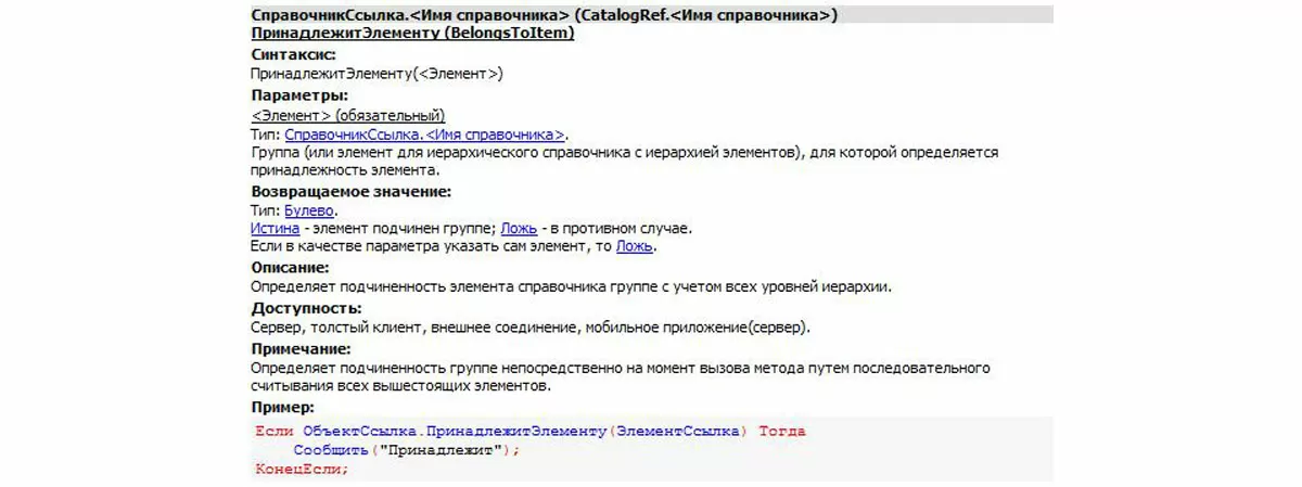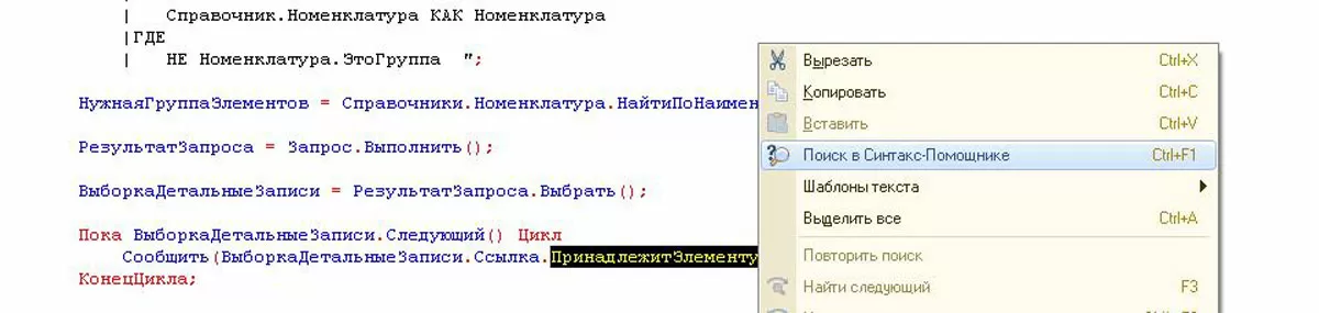В конфигураторе находим строку и метод, на который указывало сообщение об ошибке, и нажимаем на него правой кнопкой мыши. Выбираем пункт «Поиск в синтакс-помощнике» и платформа самостоятельно ищет справочную информацию по выделенному методу. В справке мы видим не только подробное описание параметров и самого метода, но и пример. Сверив пример с нашим кодом, приходит понимание, что кавычки не нужны и без них все работает.