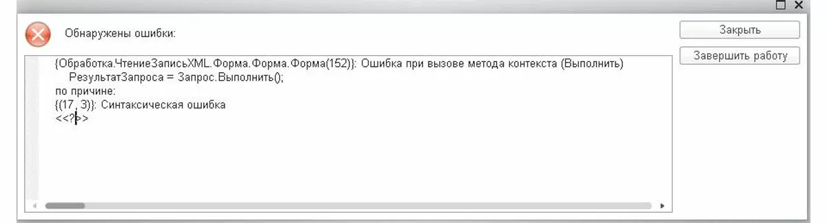 Приведенный текст ошибки программисту 1С скажет, что в модуле формы обработки «ЧтениеЗаписьXML на 152 строчке кода не может выполниться запрос. Причина в том, что на 17 строчке запроса нет чего-то, что ждал компилятор. Таким образом, чтобы убрать подобное сообщение, необходимо выяснить, что там должно быть и написать недостающий код.