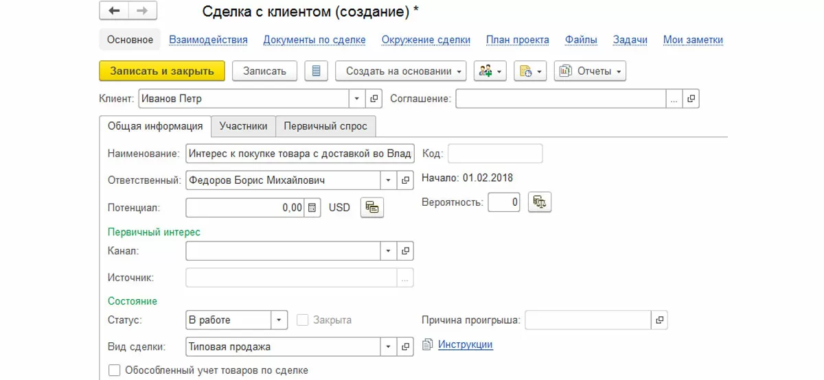 Рекомендуется оформлять сделку на ранних стадиях работы с клиентом, когда может быть еще не понятен не только конкретный состав товарных позиций или услуг, интересующих клиента, но даже не известна примерная сумма потенциальной продажи.