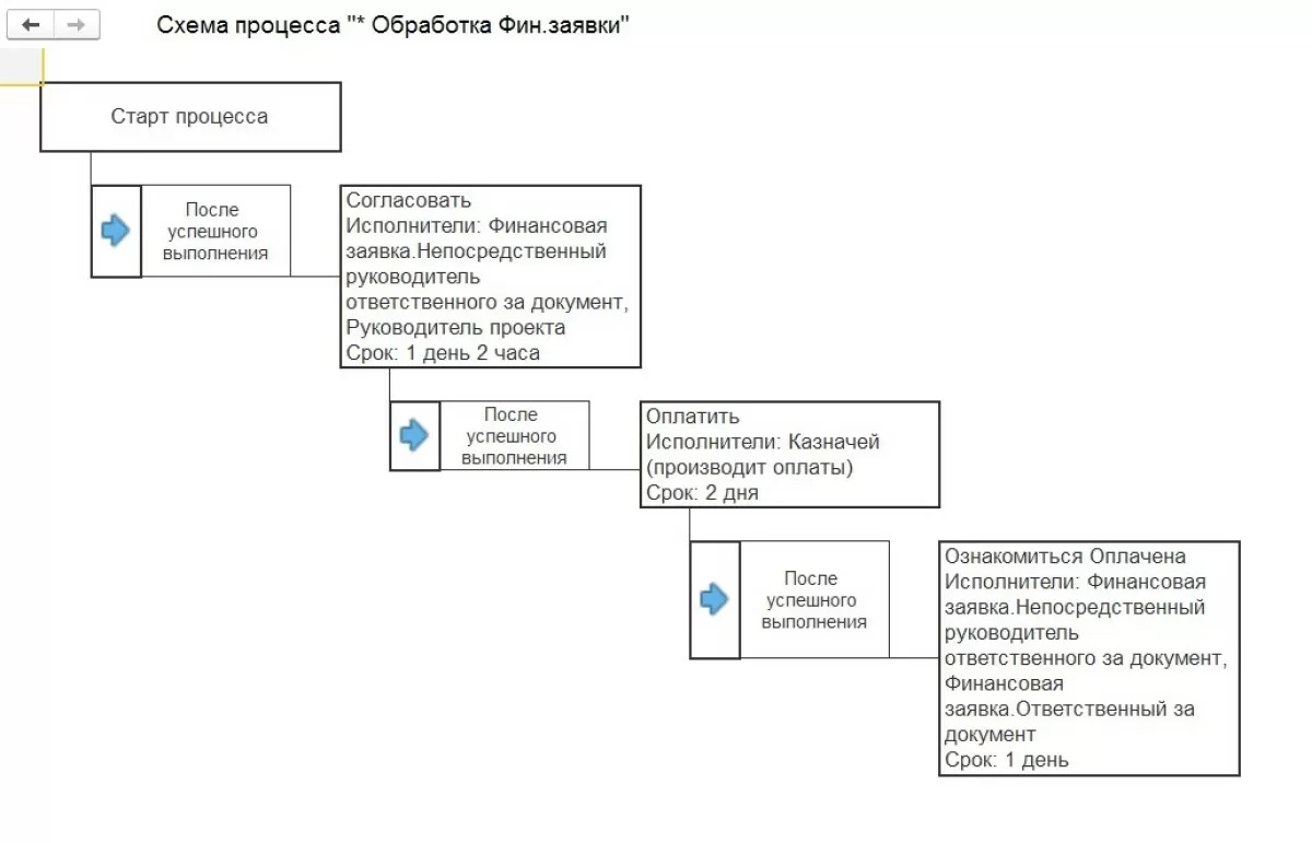 Для целей документооборота организации из нашего примера настроены комплексные процессы. Процессы четко определены на виды документов, для которых они предназначены, и для которых они доступны. Также настроен автоматически старт процессов без участия пользователей.