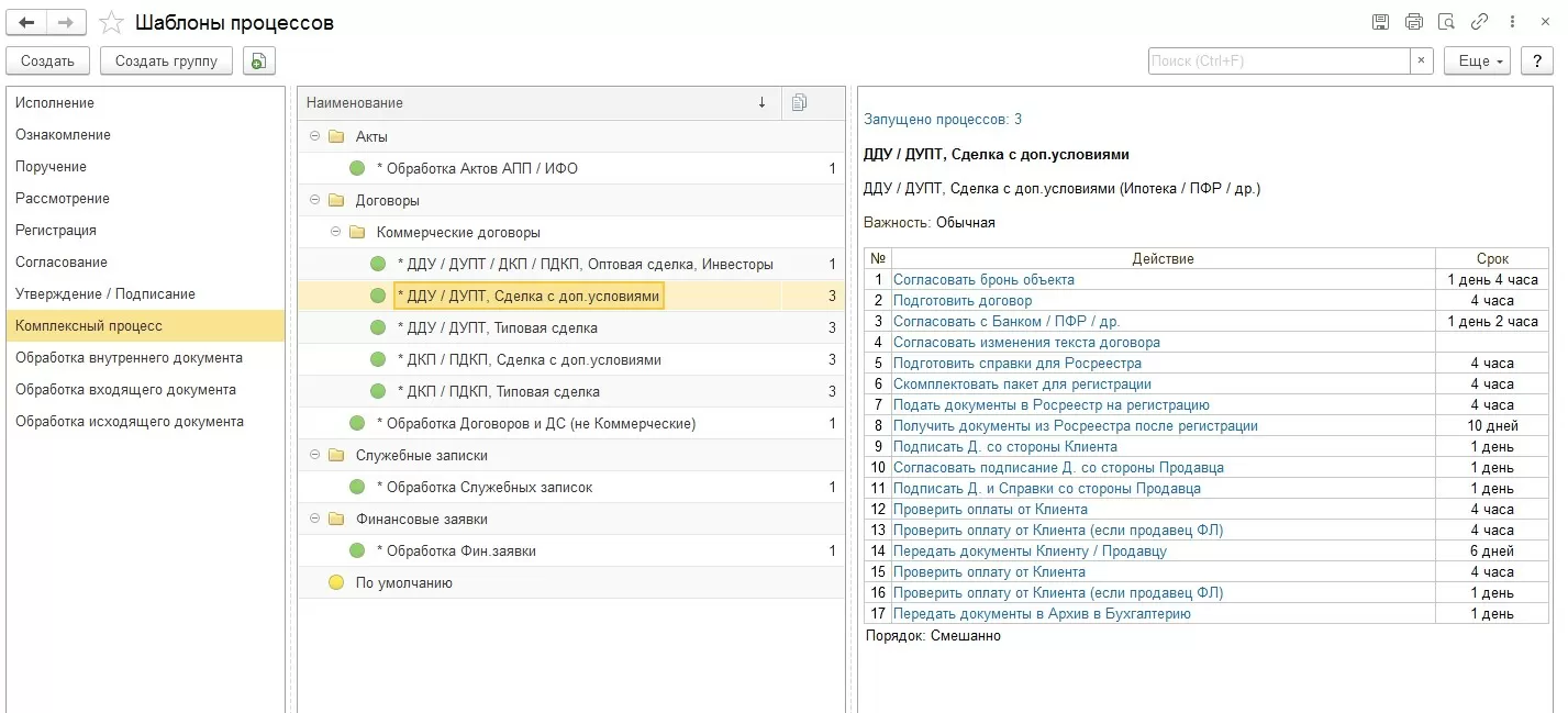 - Повторяющиеся процессы для документов. Например, процессы для регулярного исполнения обязательств по договору;