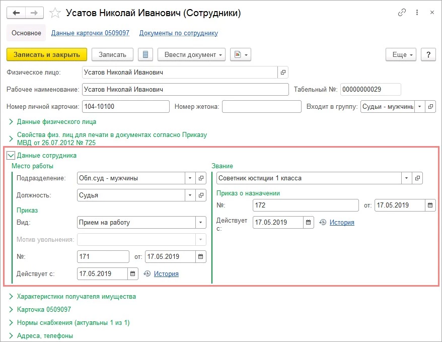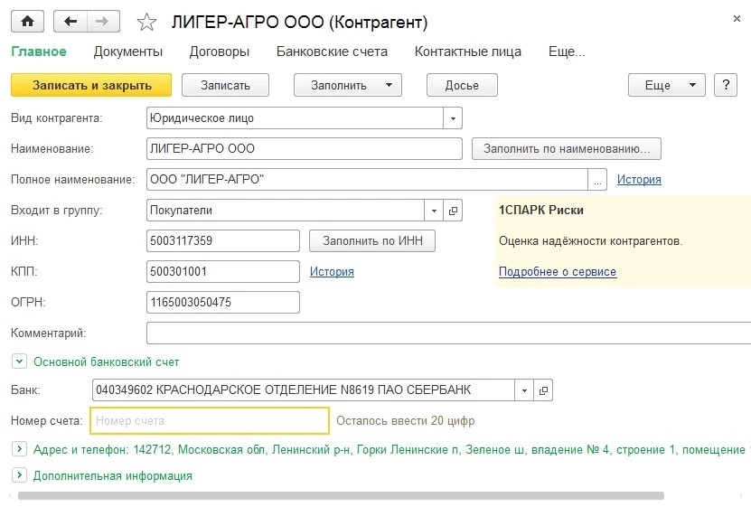 - После заполнения всех полей нажмите Записать и закрыть.