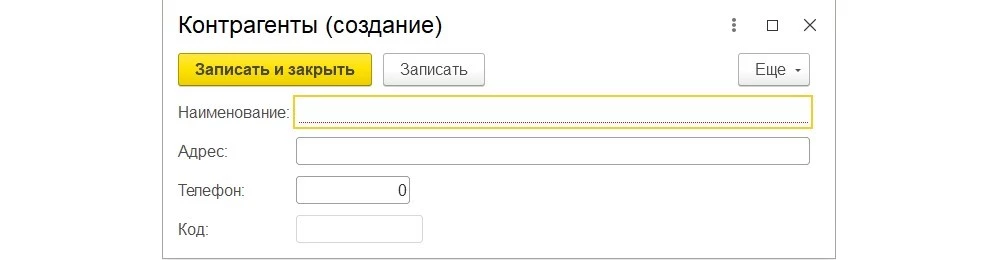 - В открывшейся форме заполните необходимые поля. Например, для справочника Контрагенты это может быть наименование организации, ИНН, контактные данные и другие реквизиты.