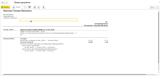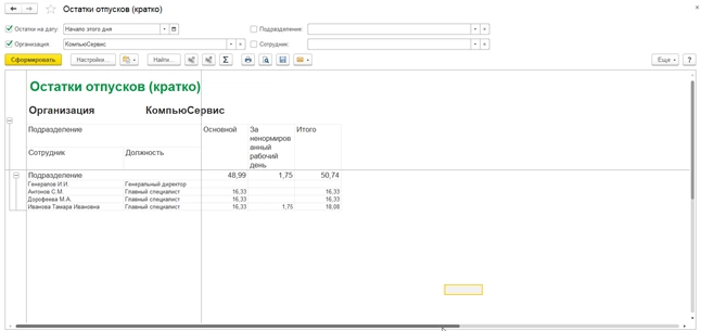 - Информация о накоплении отпускных дней на дату отпуска в разрезе всех (основной, дополнительные) отпусков, на которые человек имеет право.