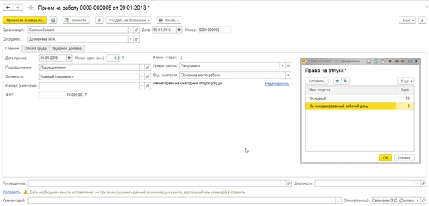 Право на отпуск (основной и дополнительные отпуска) в рассматриваемой конфигурации оформляется сразу во время приема на работу через «Прием на работу» по ссылке «Редактировать».