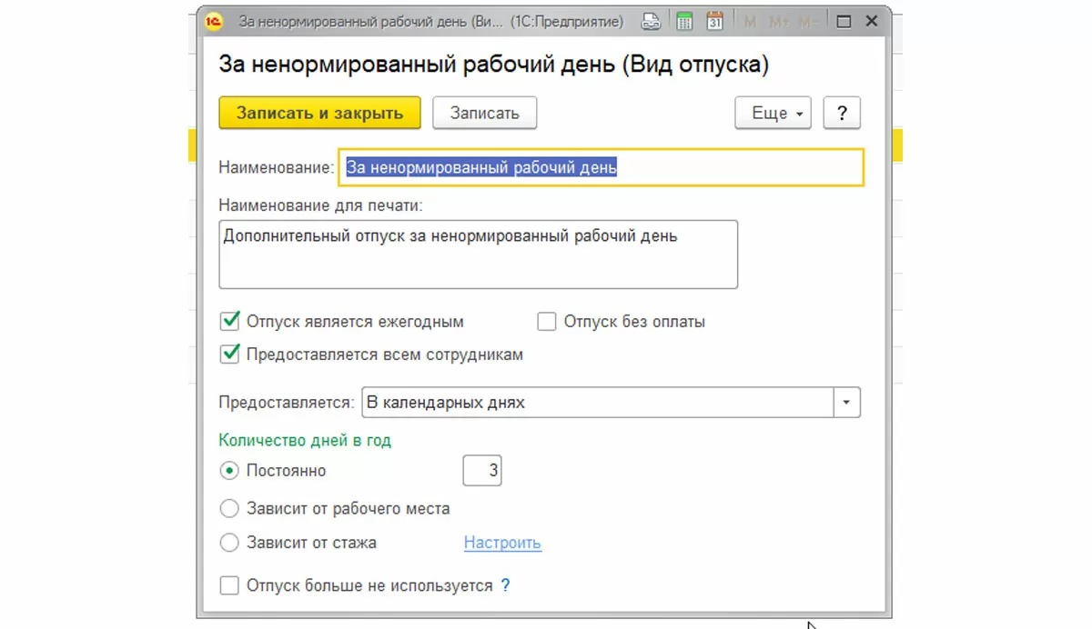 - Наименование для печати – название предоставляемого отпуска для печатной формы приказа на отпуск: «Дополнительный отпуск за ненормированный рабочий день»;