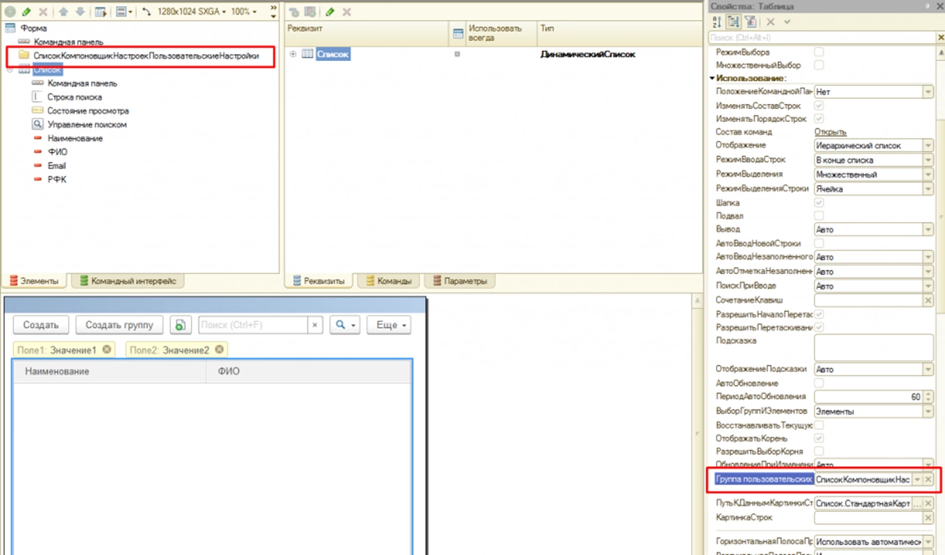 Динамический список в отличие от таблицы или дерева значений – более подходящее решение для реализации форм содержащих какие-либо списки, т.к. динамический список предоставляет наиболее широкий набор инструментов для работы с отбором, группировкой полей, сортировкой. Данный отбор можно установить при работе в пользовательском режиме или конфигураторе, принцип одинаков.