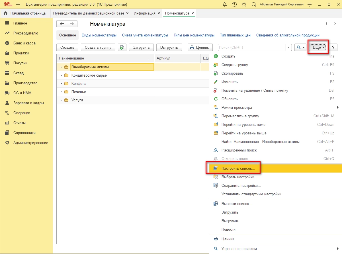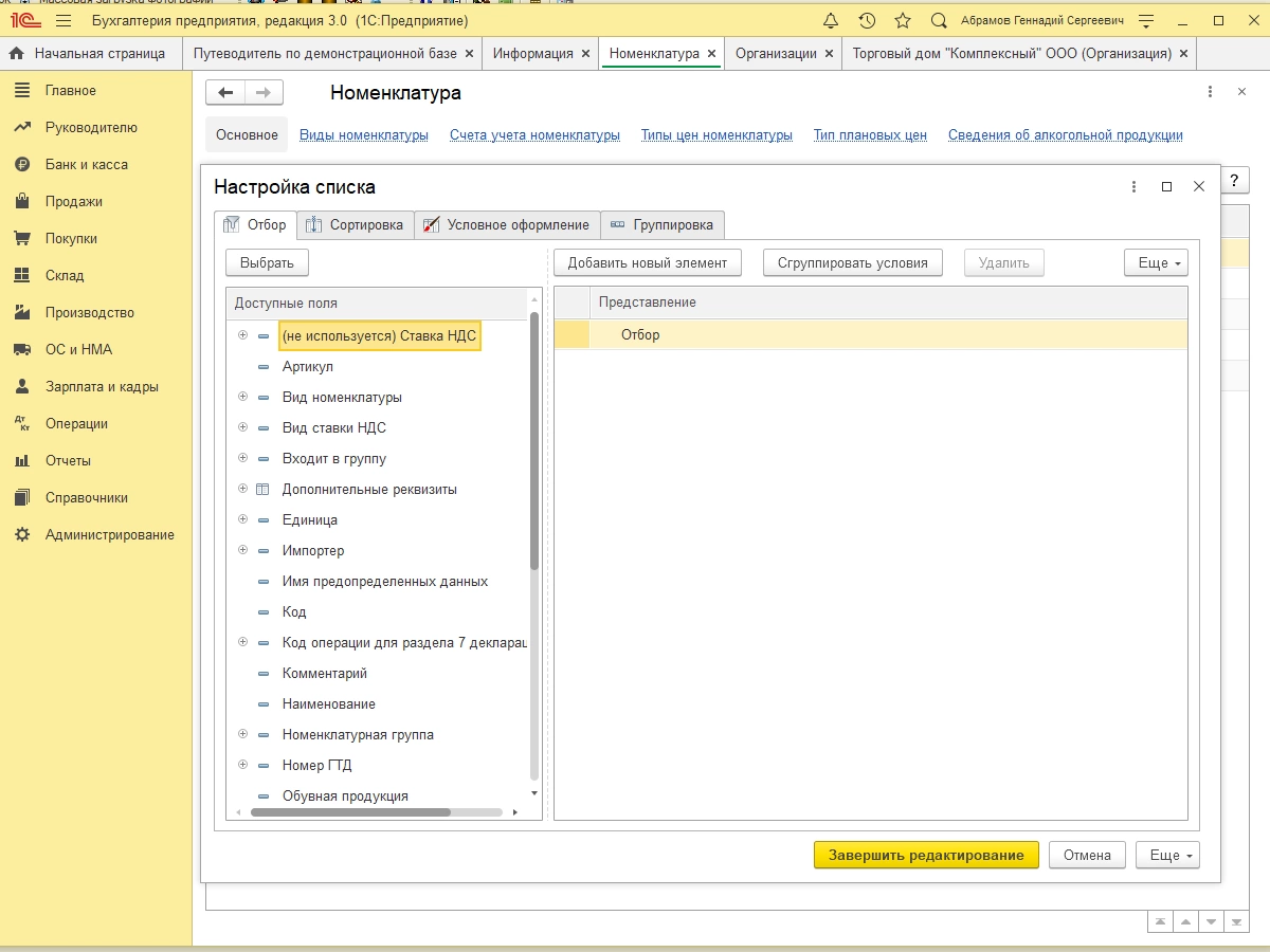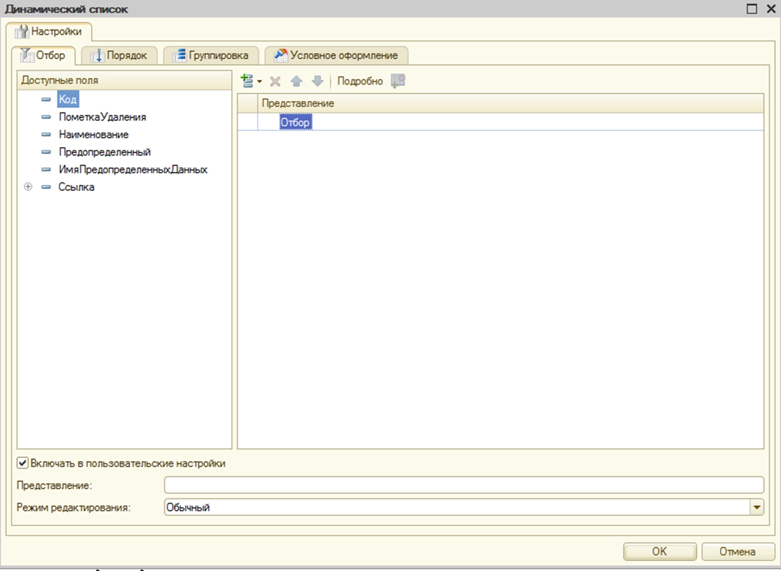 Опция «Включать в пользовательские настройки» определяет, будет ли установленный в конфигураторе отбор доступен в пользовательском режиме через пункт меню «Настроить список».