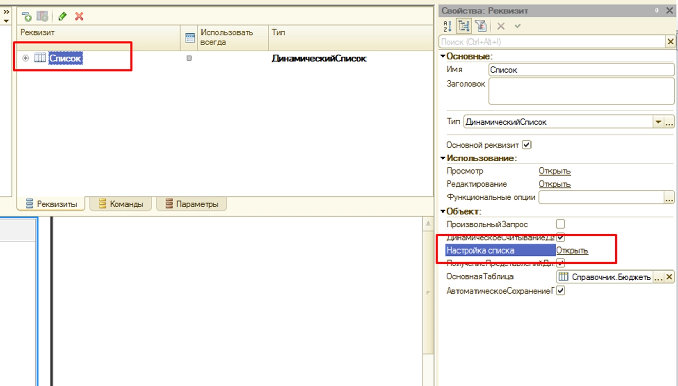 Принцип установки фиксированного отбора в конфигураторе не отличается от установки в пользовательском режиме описанном выше. Чтобы установить отбор, мы должны открыть настройки динамического списка.