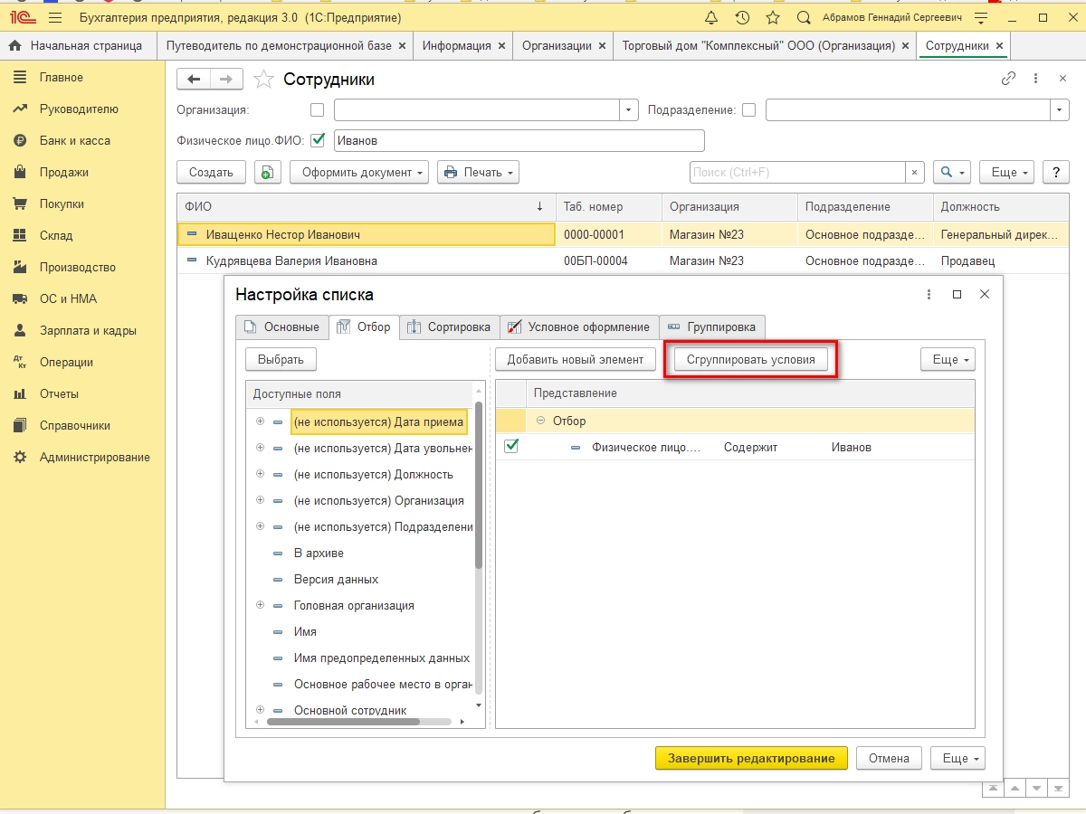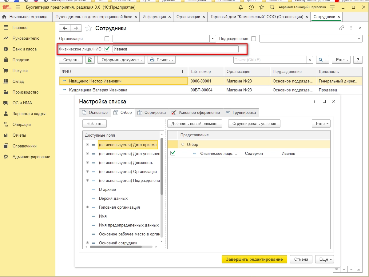 Данный отбор будет сохранен только для текущего пользователя, что позволяет гибко производить кастомизированные настройки динамического списка. Однако если стоит задача сделать фиксированный отбор для определенного списка для всех пользователей системы, ее мы сможем решить только через конфигуратор.
