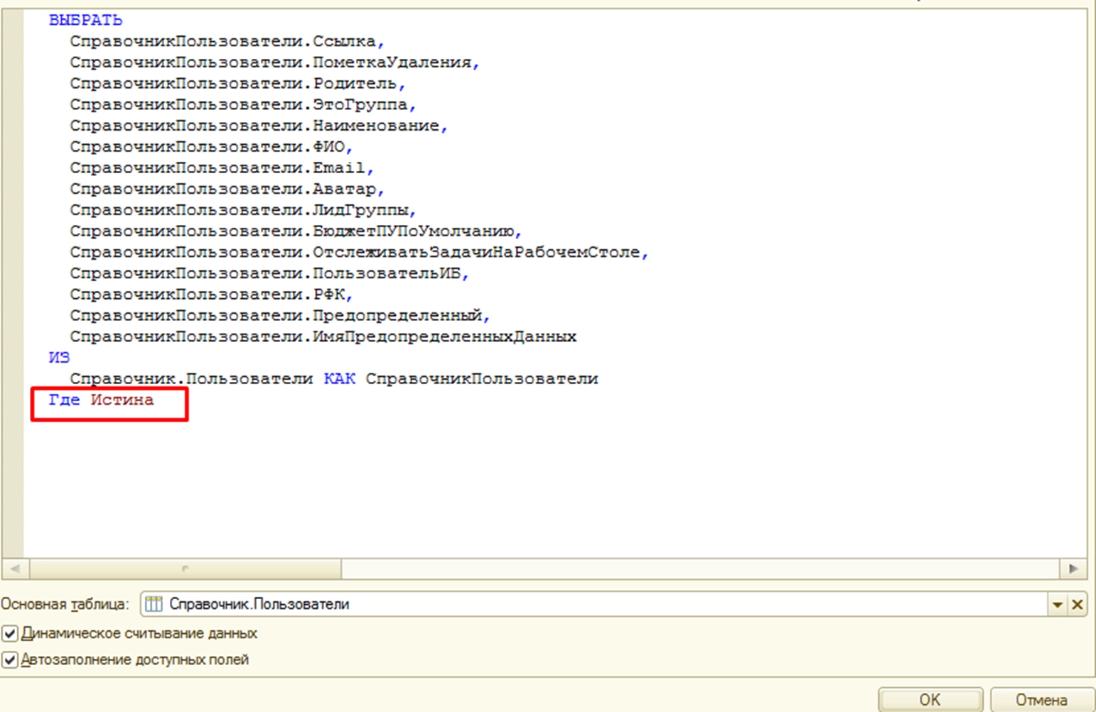 Для этого к тексту запроса добавляем условие «ГДЕ Истина»…