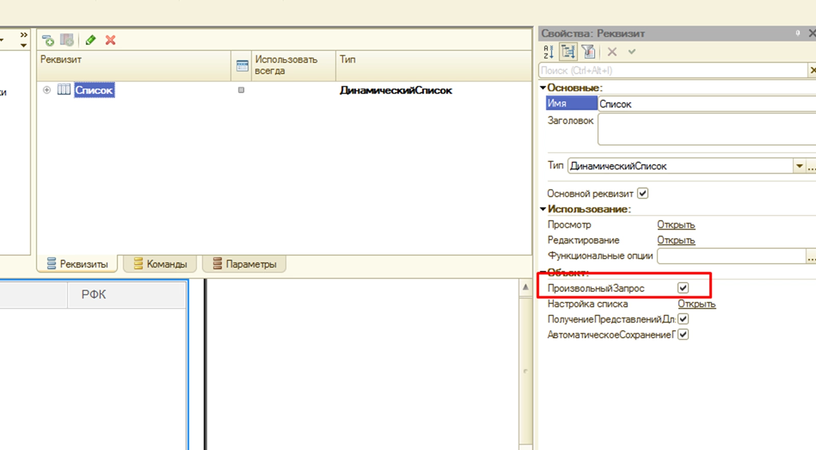 Отбор в динамическом списке также можно производить через изменение текста запроса динамического списка. Этот вариант работает, когда динамический список сделан через «произвольный запрос».