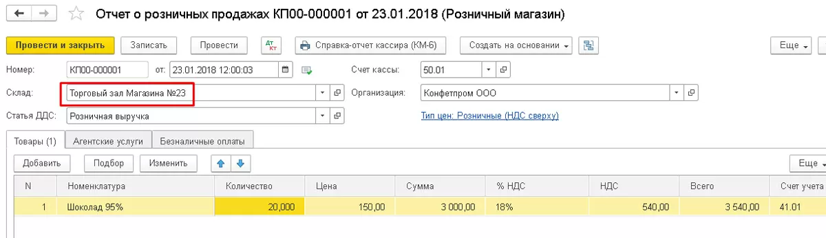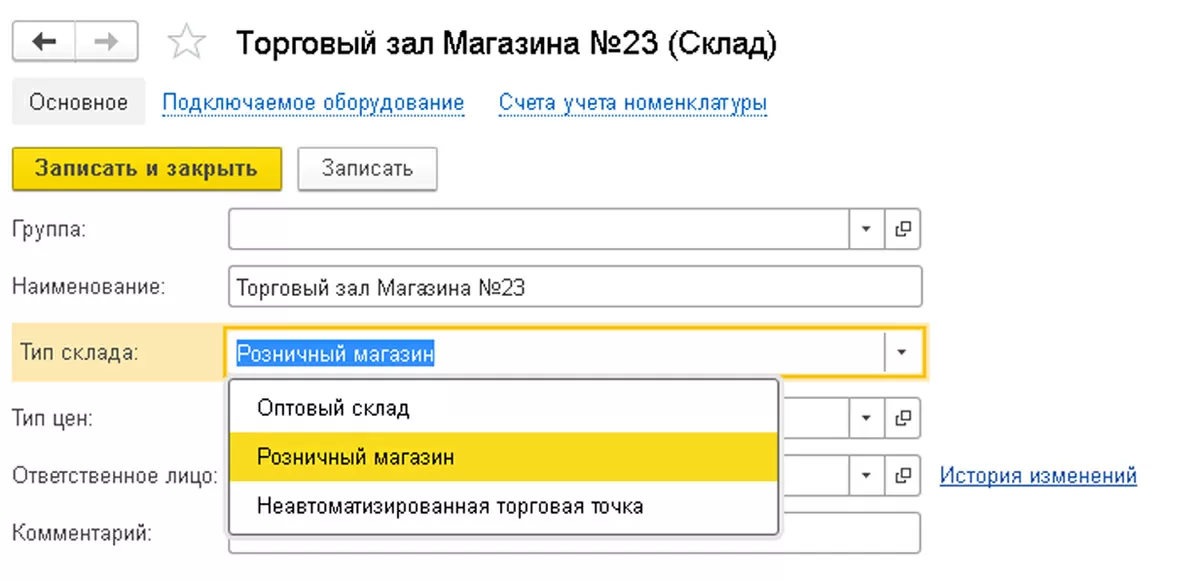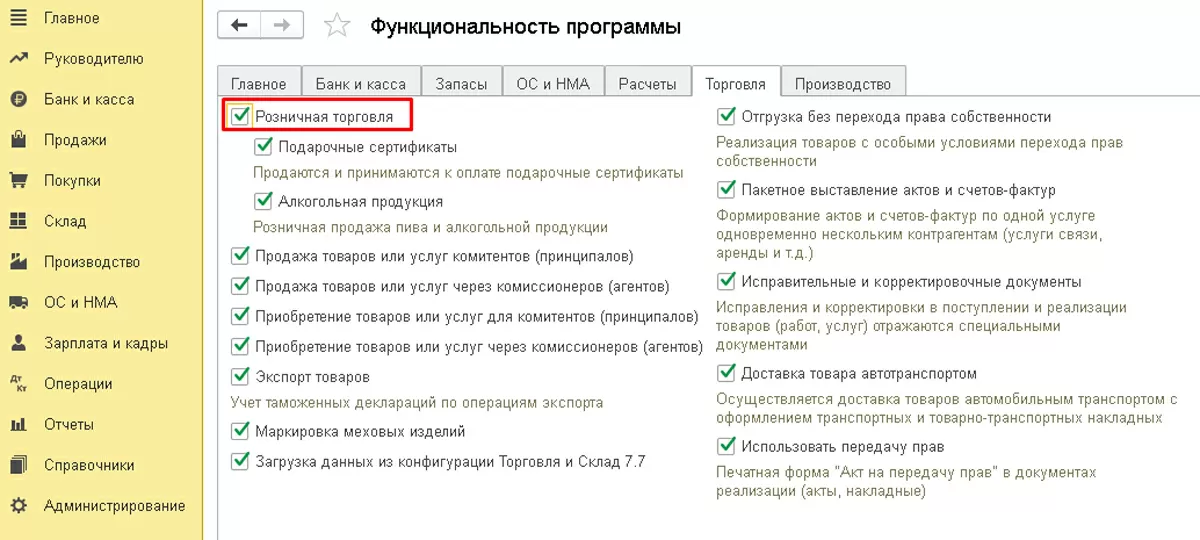 В программе для бухучета розничный торговый объект рассматривается как складское помещение. Большое значение имеет настройка для розничного склада: автоматизированный это торговый объект или неавтоматизированный*.
