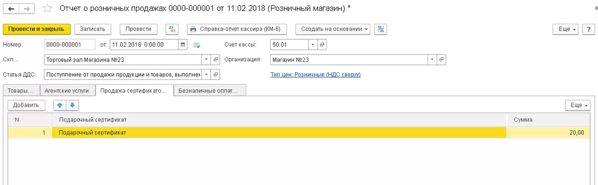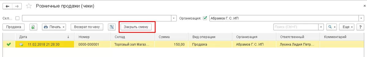 Поскольку в большинстве магазинов устанавливают кассовое оборудование/фискальные аппараты, розничные продажи также можно оформлять с помощью чеков: в конце дня при закрытии смены автоматом создается документ «Отчет о розничных продажах», в котором аккумулируются все продажи по чекам за день.