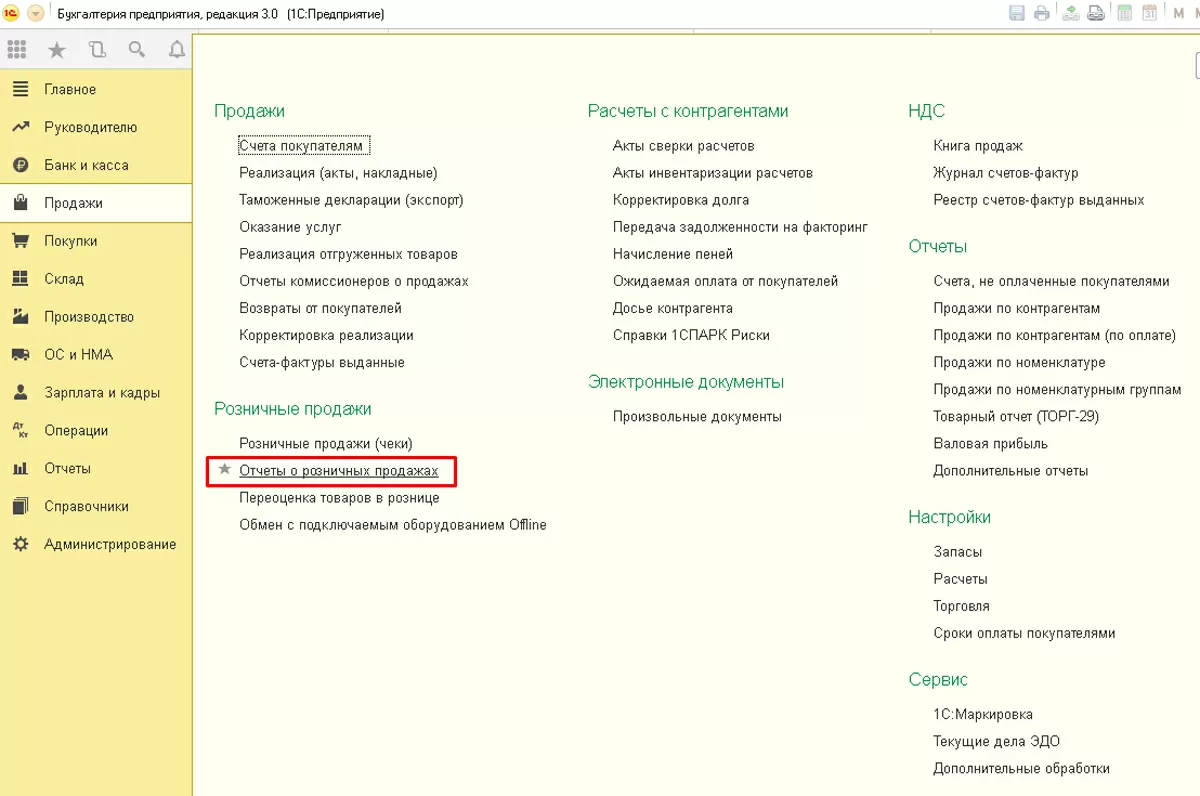 Розничные торговые продажи в бухгалтерской программе отражаются стандартным документом, входящим в конфигурацию «Отчет о розничных продажах». Открывается документ в режиме предприятия из раздела «Продажи».
