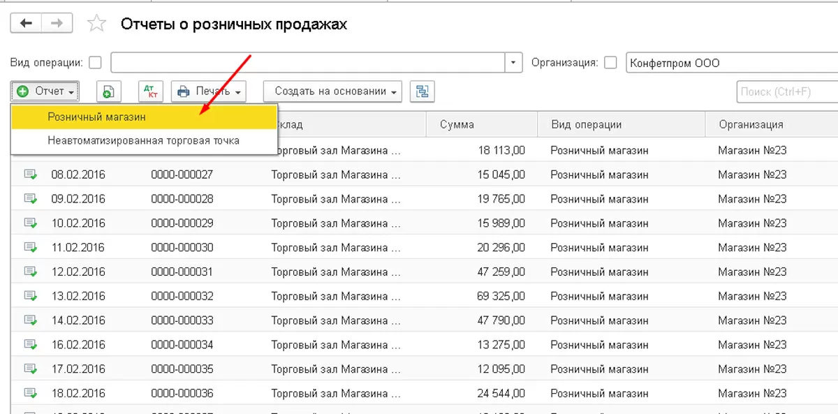 Документ о продаже товара можно ввести вручную. Для этого в списке нужно нажать «Отчет»/«Розничный магазин»*.