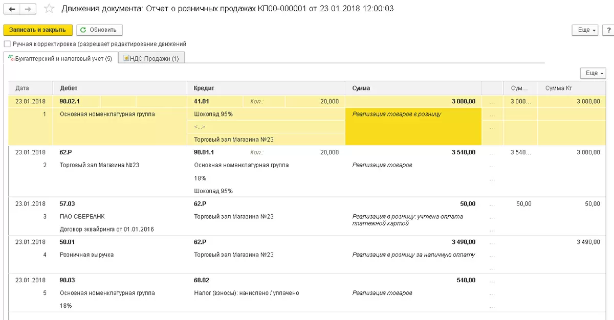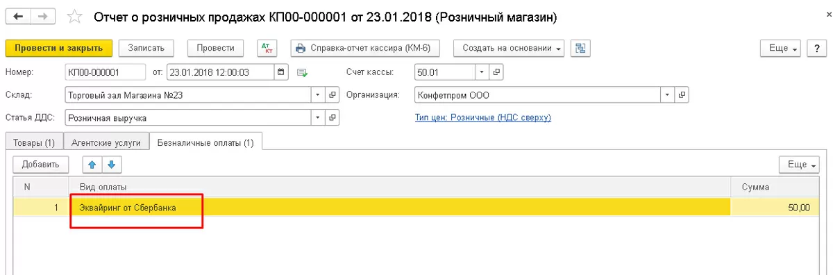 Реализацию товаров в АТТ необходимо вводить посредством документа «Отчет о розничных продажах». Он делает проводки в 1С по бухучету и налоговому учету, в том числе и на оприходование денег в кассу.