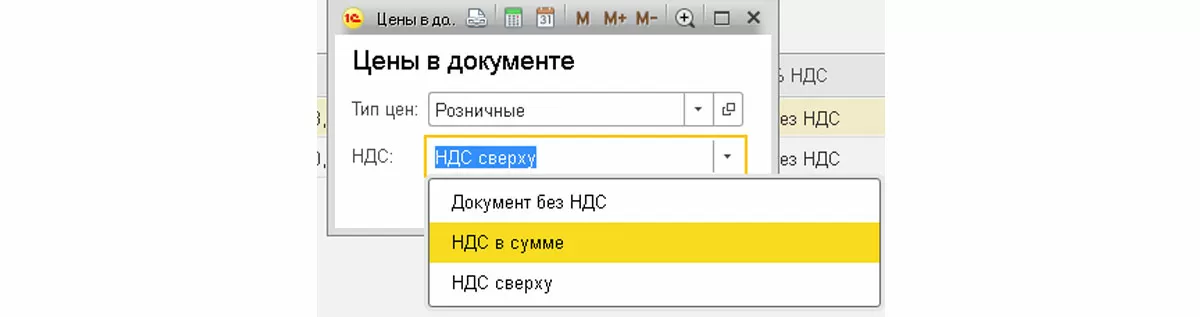 Имеется возможность указать, как отражать НДС: включать в сумму/отражать сверху/ не учитывать.