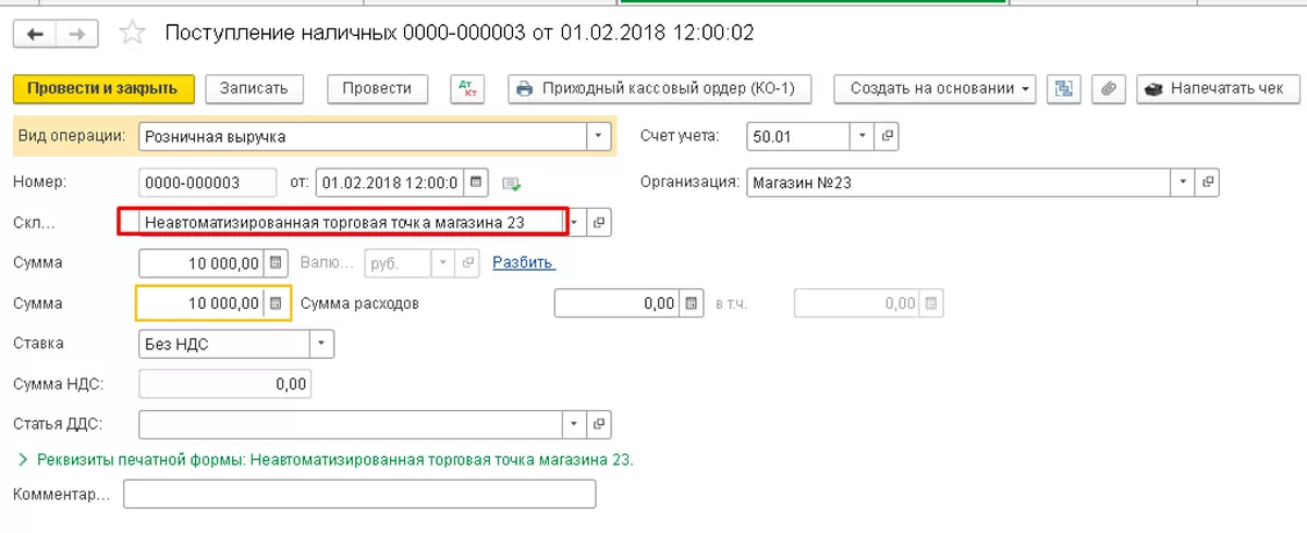 Оприходование выручки от продажи в денежную кассу предприятия оформляется документом принятия денег «Поступление наличных» с такой операцией, как «Розничная выручка», которую можно оформить на основе документа о розничных реализациях. Этот документ не формирует проводок ни по бухгалтерскому, ни по налоговому учету (т.к. проводки выполняет документ «Отчет о розничных продажах»), но попадает в отчет «Кассовая книга».
