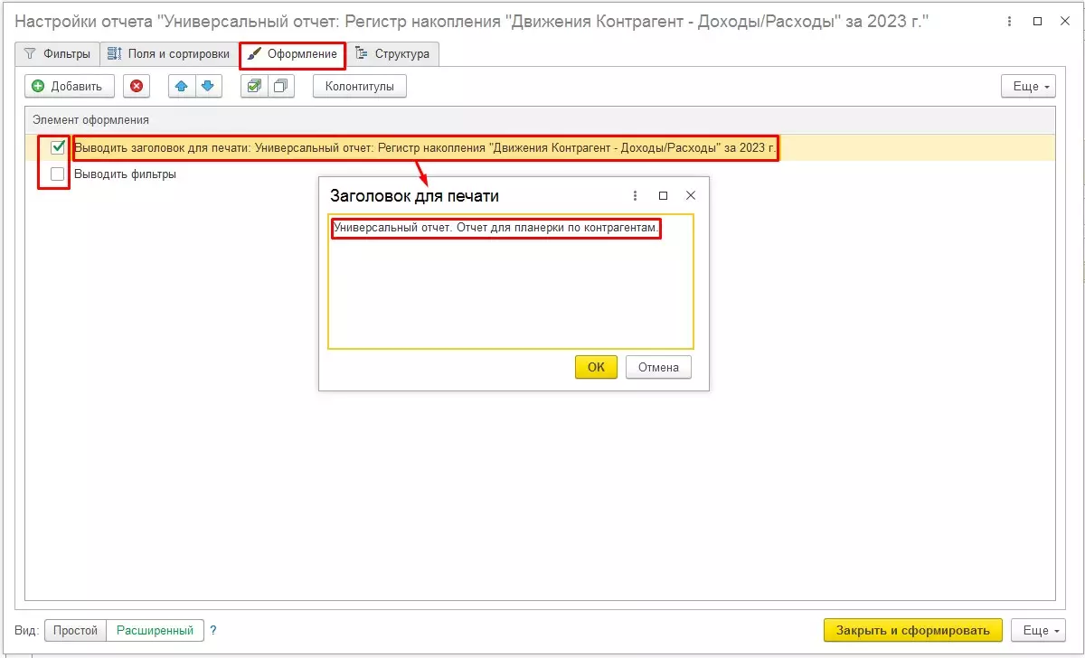 На закладке «Оформление» предоставляется возможность оформить отчет, задав цвет фона, текста, шрифт, формат отображаемых данных. В нашем примере выведем удобное наименование отчета и отключим вывод фильтров.