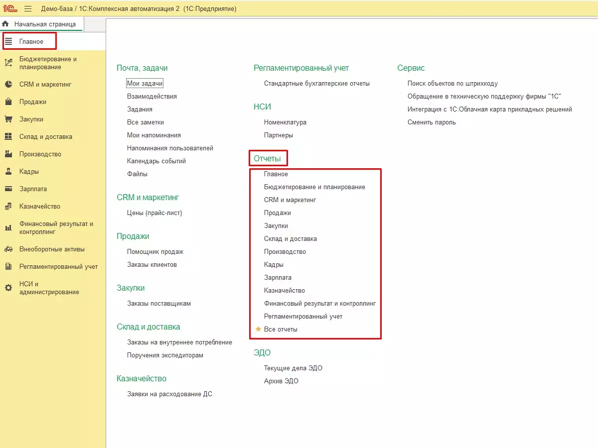 В интерфейсе программы на главной странице в разделе Отчеты можно увидеть отчеты, сгруппированные по темам и выделенные в группу «Главные». Если точно не знаете, к какой группе относится отчет, нужно посмотреть по гиперссылке «Все отчеты».