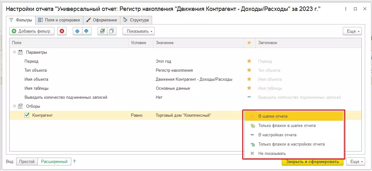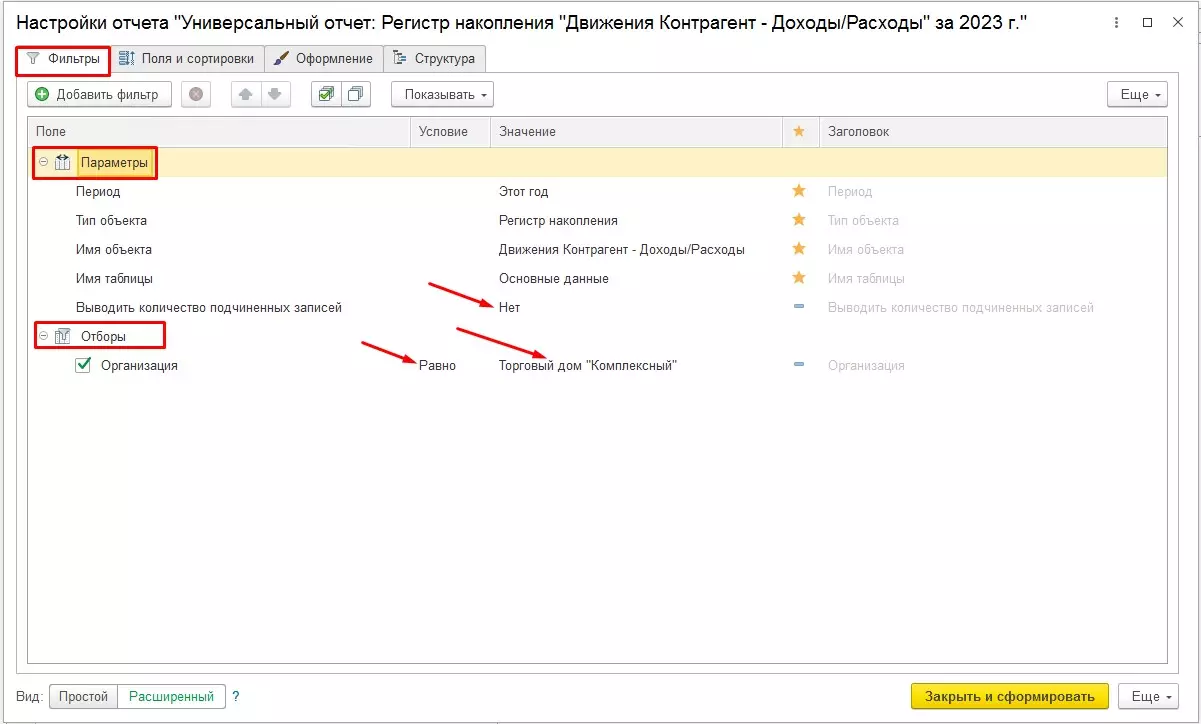 Для полноты понимания возможностей настройки выберем расширенный режим. В рамках его работы можно на закладке «Фильтры» осуществить настройку параметров отчета (Параметры) и установить значения отборов (Отборы).