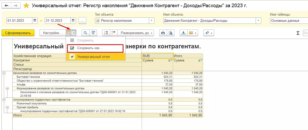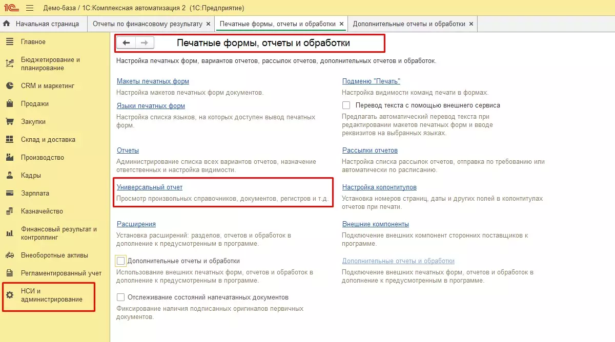 - Дополнительные отчеты, которые можно настроить в разделе Универсальный отчет по данным регистров и документов системы. Такие отчеты можно сохранять в удобном формате для дальнейшего использования.