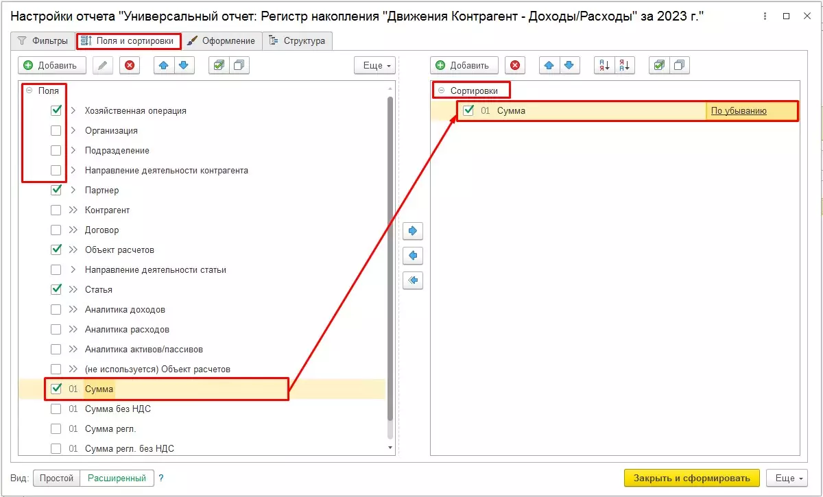На вкладке «Поля и сортировки» определяется состав необходимых полей и устанавливаются правила упорядочивания выводимых данных. В нашем примере отключим лишние поля, сняв галочку напротив наименования поля, и выведем в сортировку поле «Сумма» по убыванию.