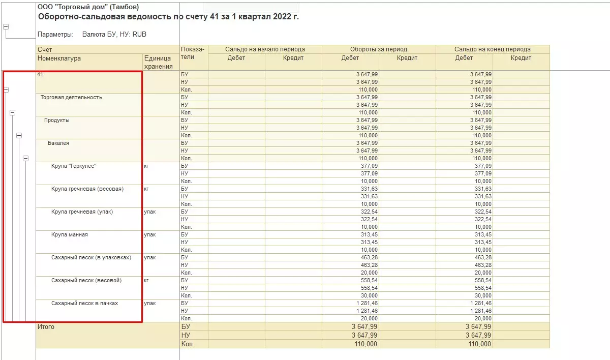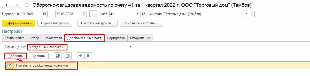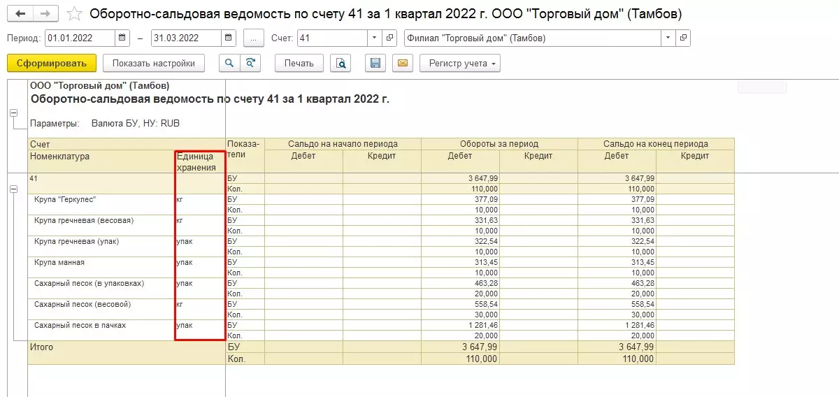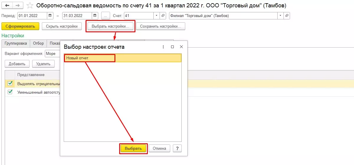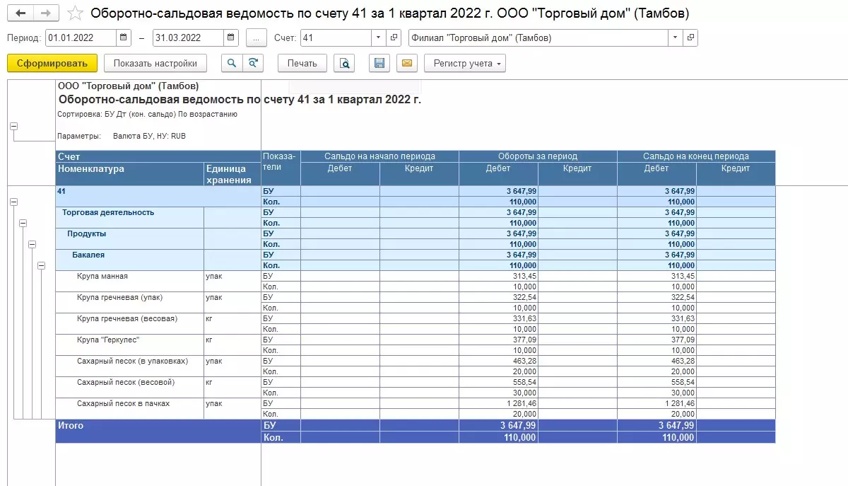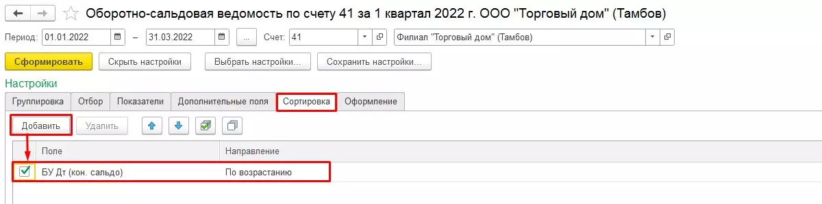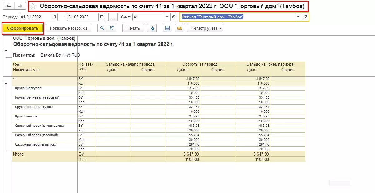Заполняем стандартные поля периода, счета, организации и нажимаем «Сформировать». Нас интересует ОСВ по счету 41 за 1 квартал 2022 года для организации «Филиал "Торговый дом" (Тамбов)». Формируем отчет в стандартных настройках.