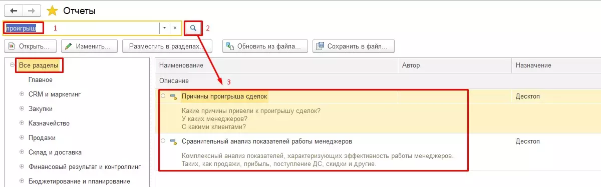 Рассмотрим еще один способ найти нужный отчет. Предположим, руководитель отдела маркетинга хочет разобраться в причинах, которые могли повлиять на неблагоприятный исход в сделке, проигрыше.