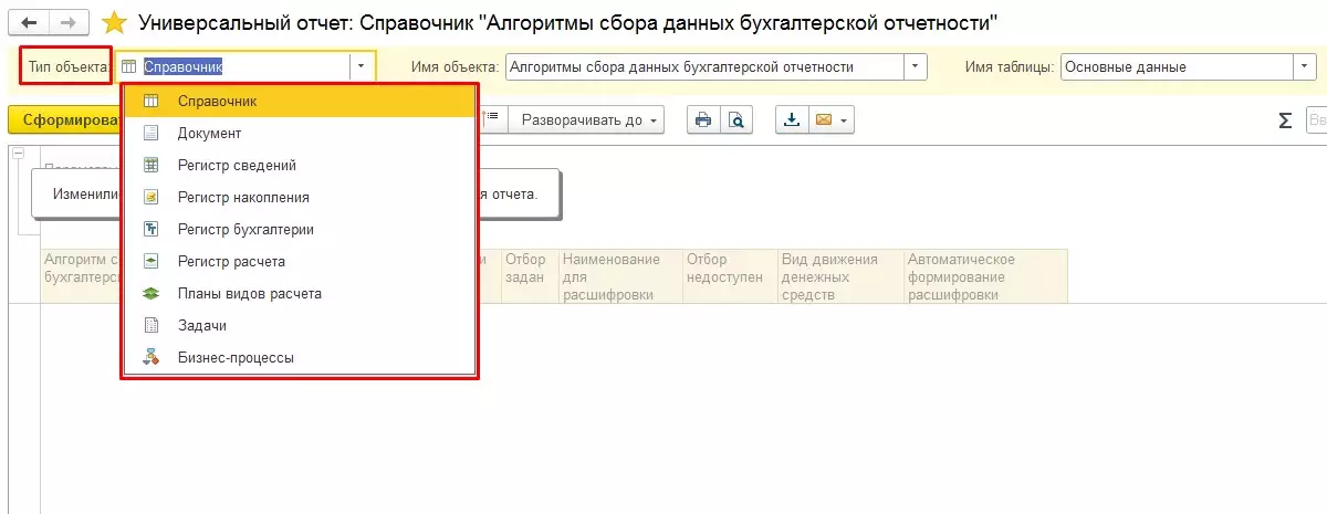 Внешний вид Универсального отчета лаконичен, удобен для пользователя и может видоизменяться в зависимости от выбора позиции списка в Типе объекта. Для одних типов требуется дополнительно задать период (например, для Документов). Для других – Имя таблицы (к примеру, для Регистра накопления). Для третьих типов нужно указать только Имя объекта (например, для Регистра сведений).