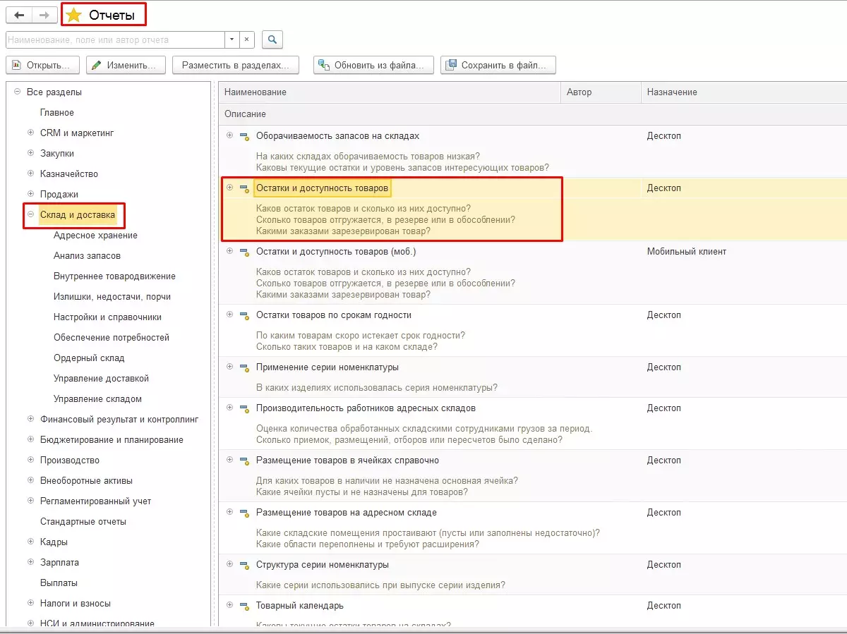 При поиске любого отчета в программе 1С, как говорили в древности, следует опираться на вопросы: «Чем должен помочь отчет? Что хотим найти, определить, увидеть?» Например, нам нужен отчет о наличии товаров на складах. Очевидно, легче всего найти информацию по товарам в разделе Склад и доставка. Открываем нужный раздел. В правой части журнала располагаются все отчеты, относящиеся к искомой теме. Для каждого отчета есть краткое описание, которое поможет найти информацию, наиболее соответствующую запросу.