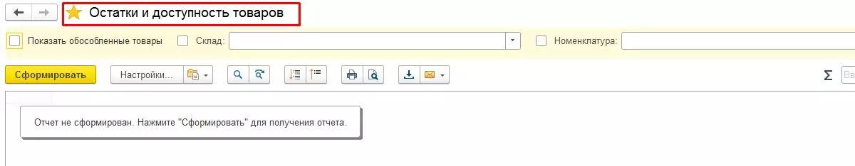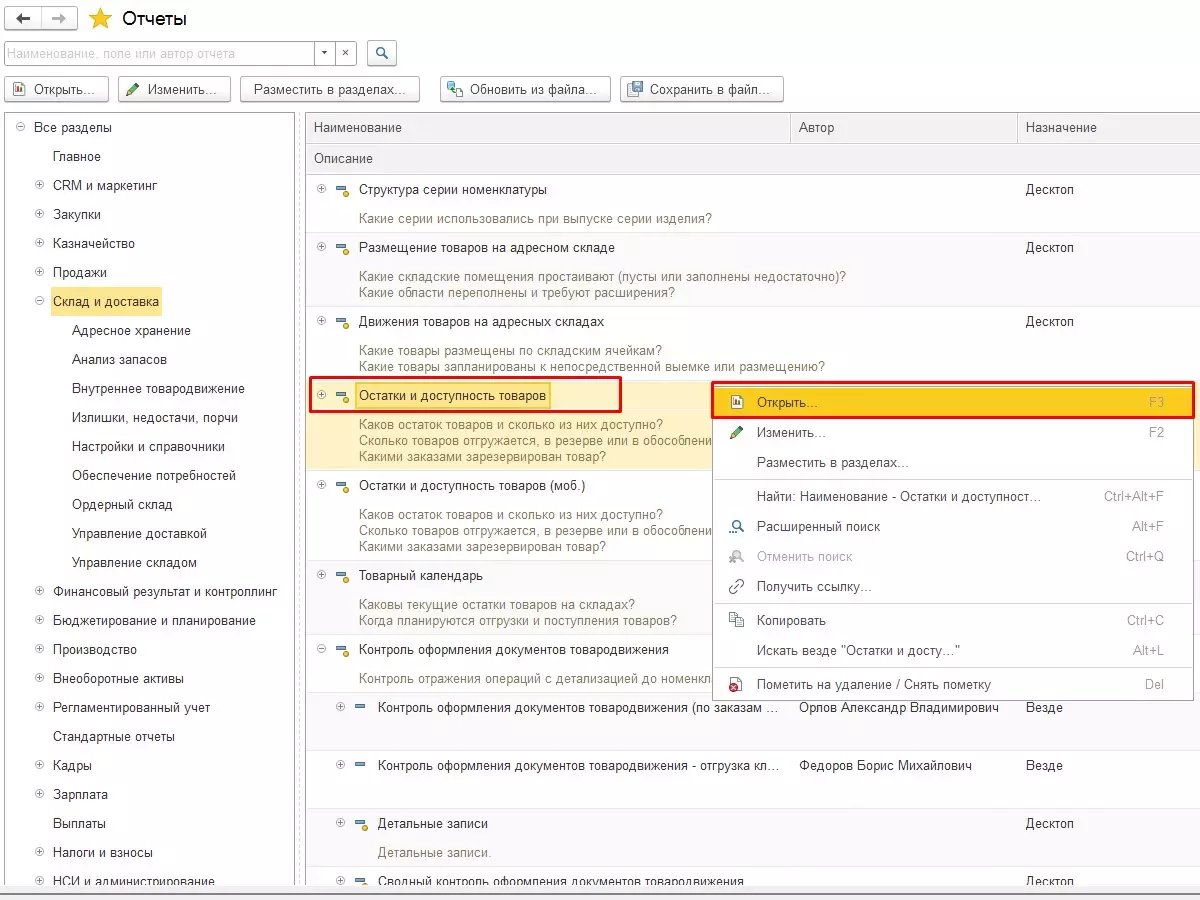 Находим подходящий отчет Остатки и доступность товаров, нажимаем правую кнопку мыши и в появившемся меню выбираем опцию «Открыть».