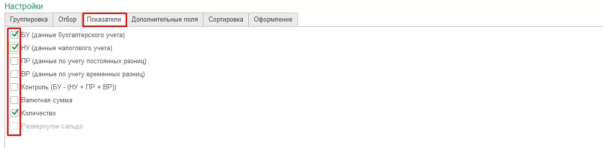 На странице «Показатели» у пользователя есть возможность настроить варианты вывода данных только в рамках бухгалтерского учета, налогового учета, количественного выражения, валюты или постоянных, временных разниц.