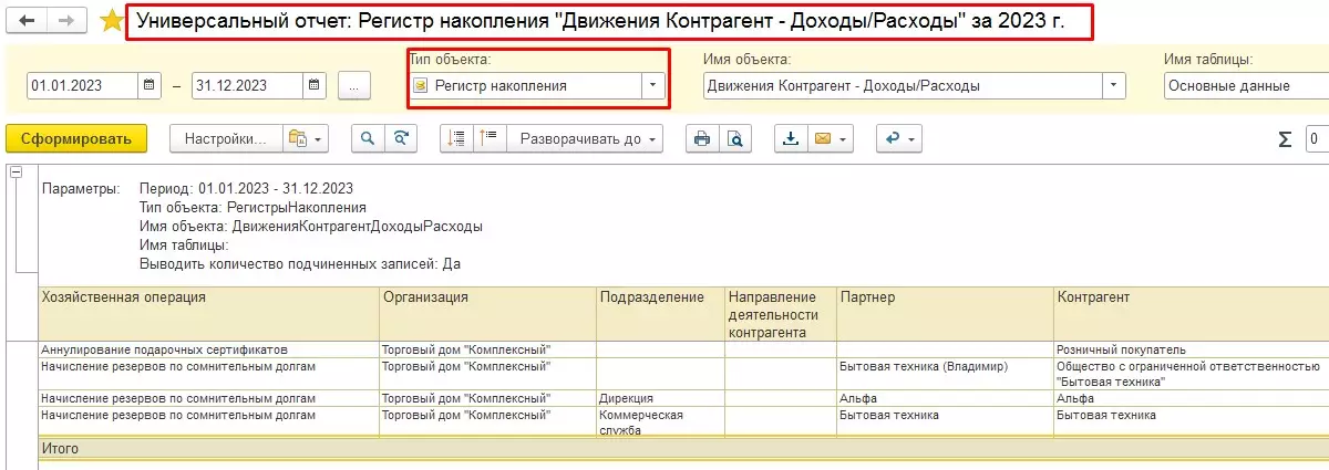 Рассмотрим настройку Универсального отчета на базе Регистра накопления. При таком выборе типа объекта нам необходимо указать период, имя объекта и имя таблицы. Предположим, нам нужно посмотреть информацию за год по регистру «Движения Контрагент – Доходы/Расходы» по основным данным. Формируем и получаем массивный отчет с большим количеством колонок, которые даже на экран не помещаются.
