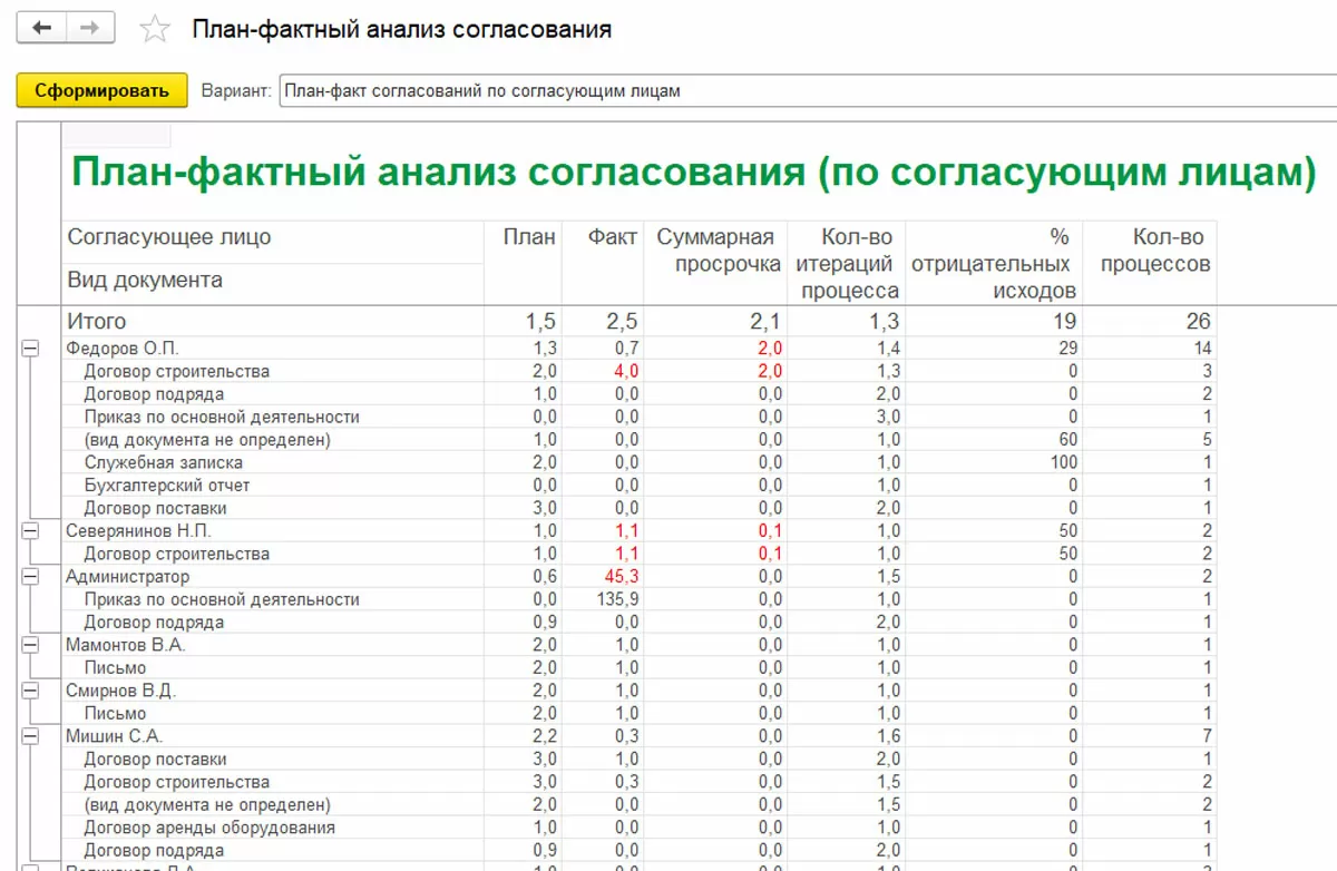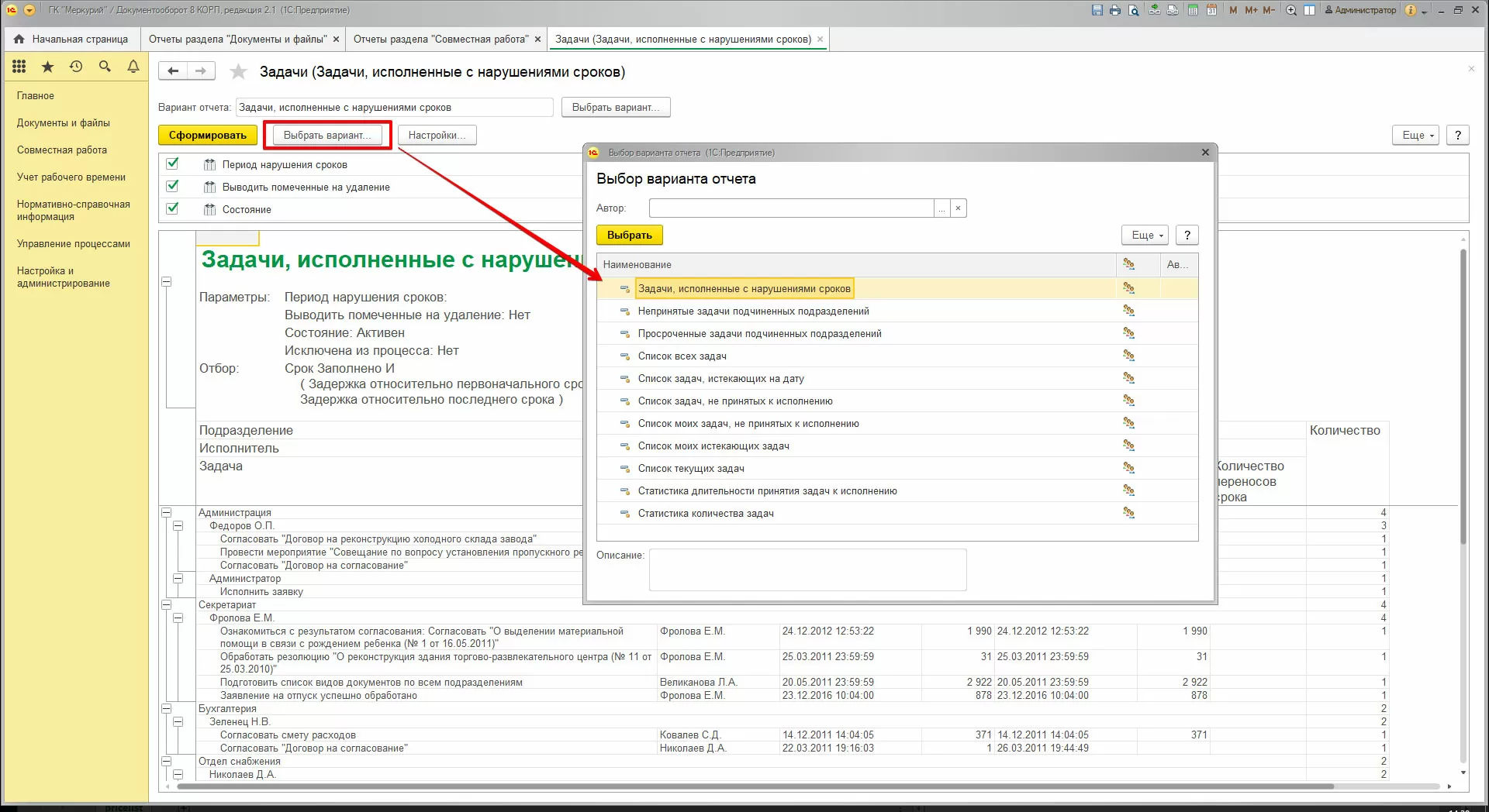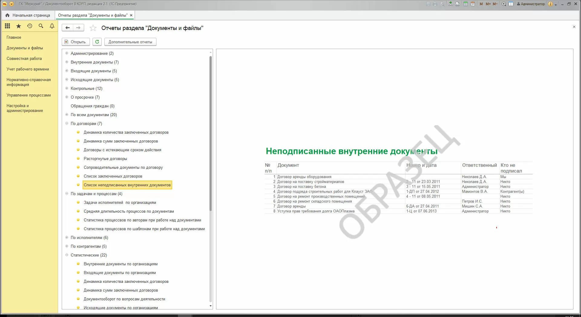 Ответ на эти вопросы можно найти в отчетности. В системе 1С:Документооборот предустановлено порядка 300 видов отчетов по различным направлениям и разрезам аналитики. А при удачном профессиональном внедрении этот список легко расширяется и дополняется необходимыми отчетными формами.
