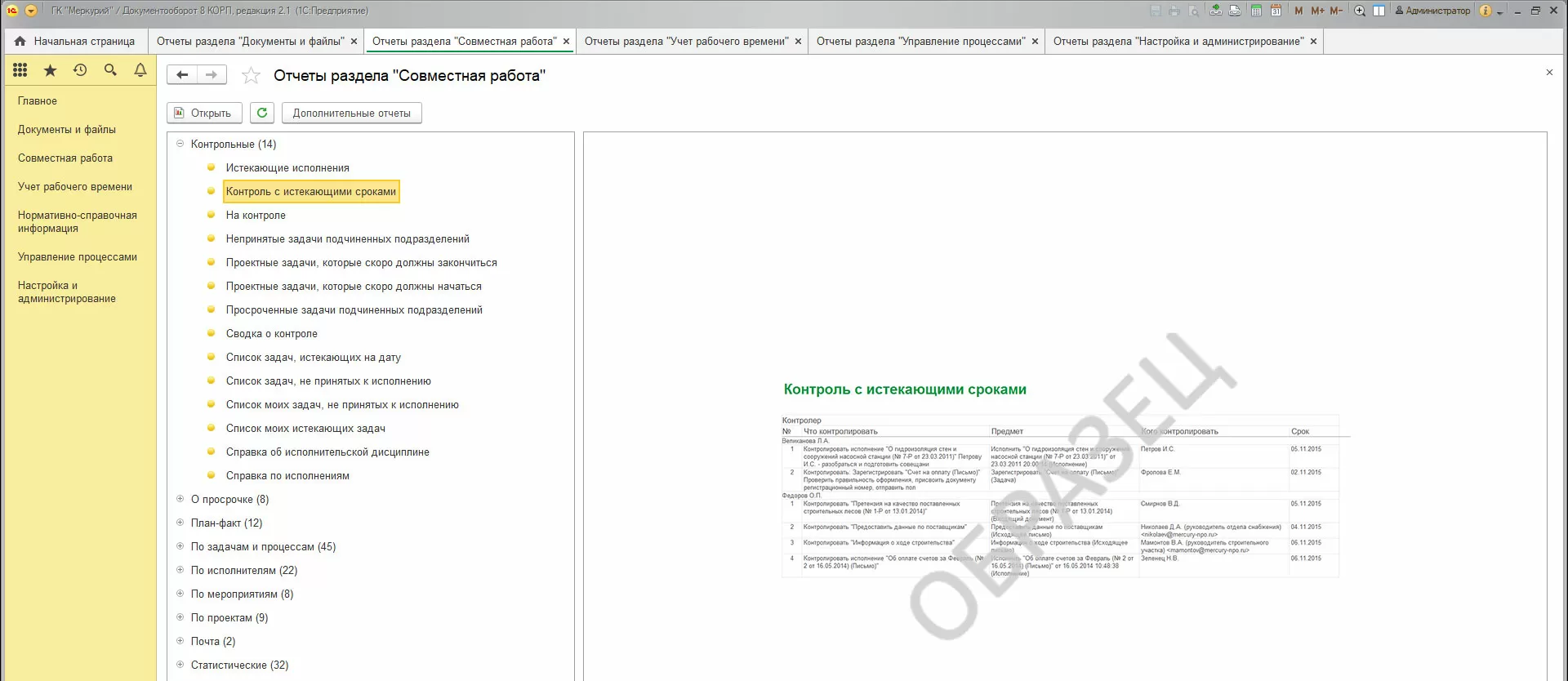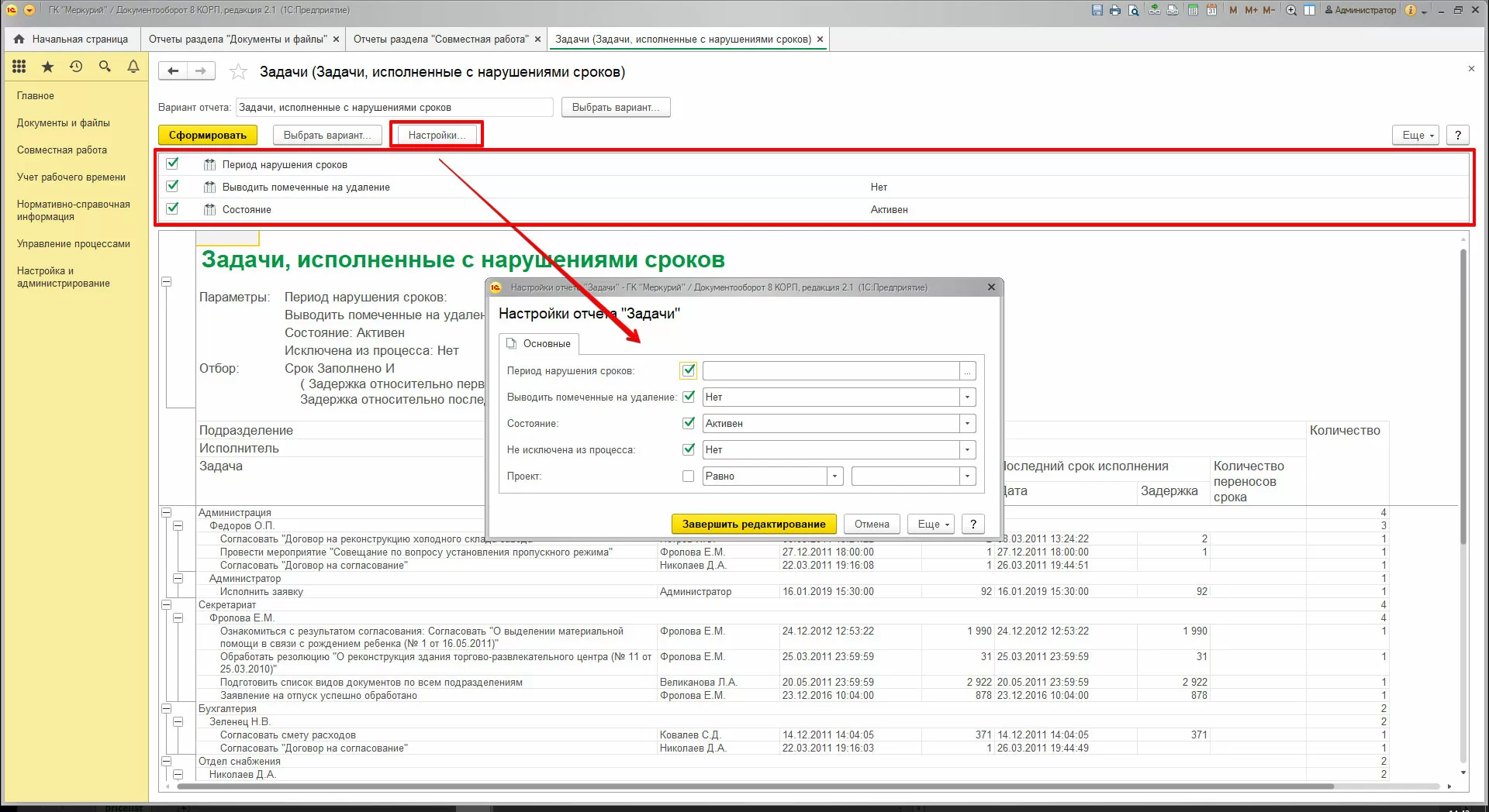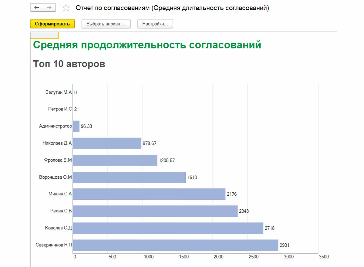 Ответ на эти вопросы можно найти в отчетности. В системе 1С:Документооборот предустановлено порядка 300 видов отчетов по различным направлениям и разрезам аналитики. А при удачном профессиональном внедрении этот список легко расширяется и дополняется необходимыми отчетными формами.