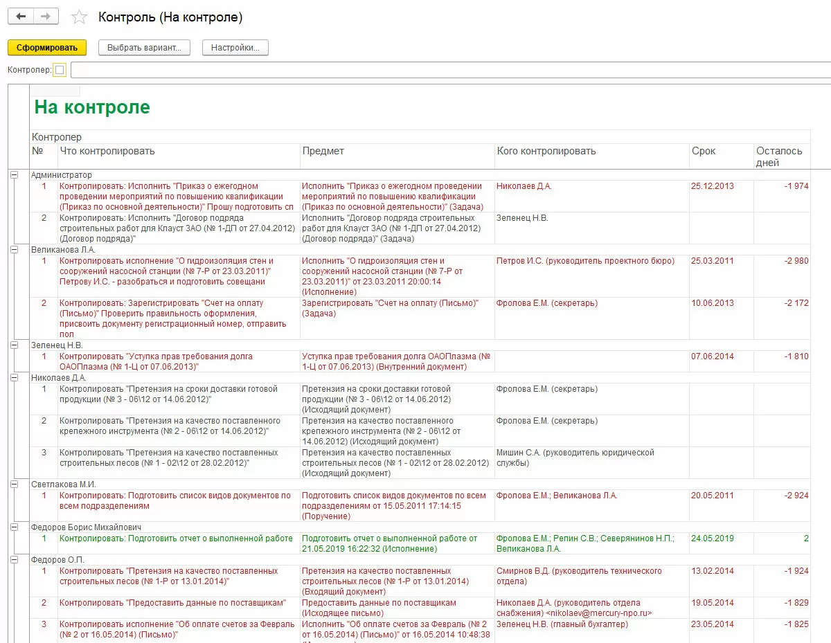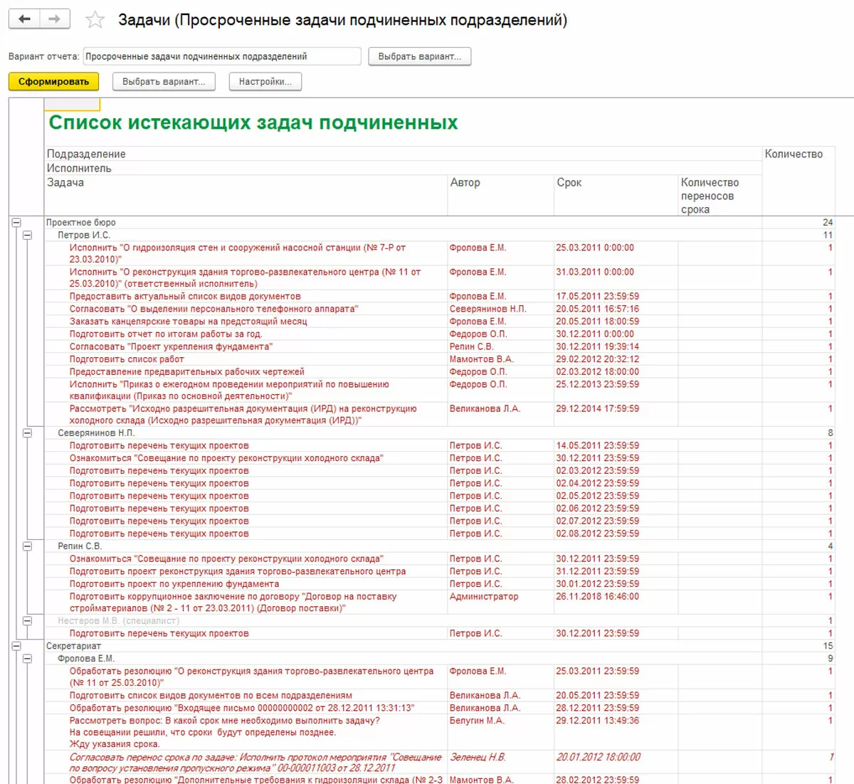 Список истекающих и просроченных задач подчиненных показывает, у какого сотрудника сколько просроченных задач на текущий момент и какие именно.